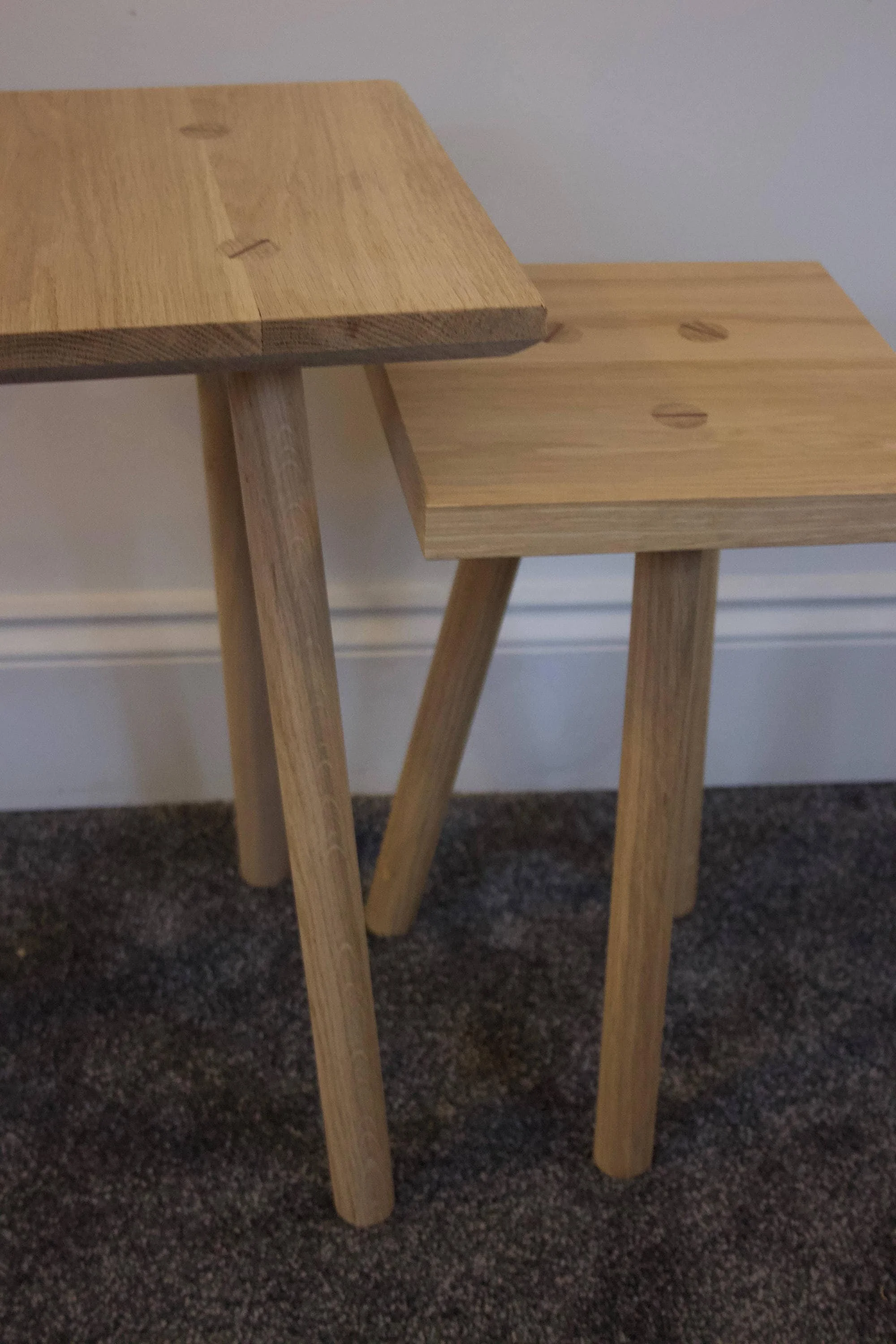 The image shows stand with woollen leg socks that I have been experimenting with and they are optional. The stools are currently made from reclaimed Beech, Oak or Cherry. They have been made using traditional hand tools and wedged tenon joints.